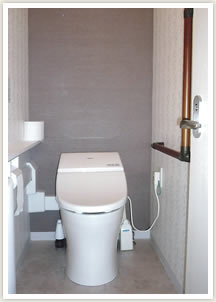 機能的なトイレ設備機器に取替、トイレ備品の収納スペースの設置、床は廊下とバリアフリーのフローリングにしました。 |